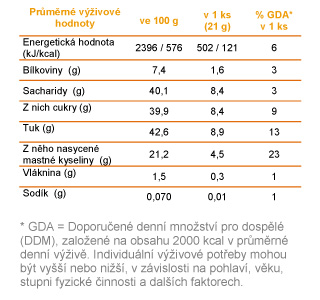 mléčná čokoláda 42 % (cukr, plnotučné sušené mléko, kakaové máslo, kakaová hmota, emulgátor: lecitiny (sójové); vanilin), lískové oříšky 14 %, rostlinný tuk a rostlinný olej, cukr, čerstvé pasterované mléko 8 %, odtučněné sušené mléko, kakaové máslo, máselný tuk, emulgátor: mono- a diglyceridy mastných kyselin, vanilin.